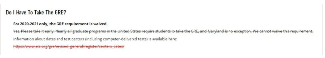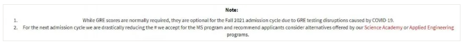 1. 受疫情影響,學(xué)校表示2021年秋季入學(xué)周期中申請者可以不提交GRE成績(之前說明GRE要求的地方也被劃線表示作廢)。