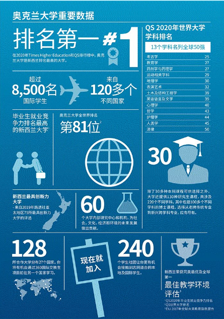 奧克蘭大學在最新的QS世界排名中位列第81名,是新西蘭唯一一所進入百強的大學,奧大在畢業生就業競爭力排名中位列第59名。